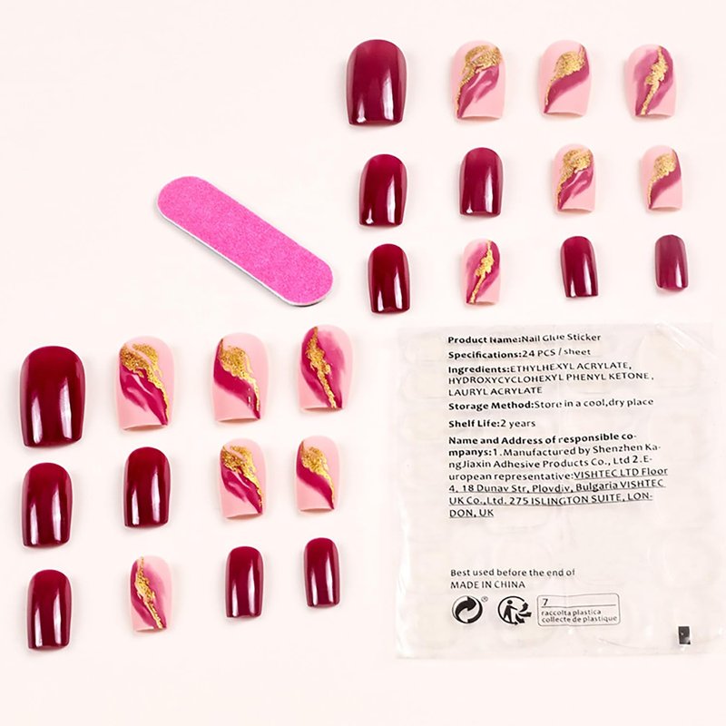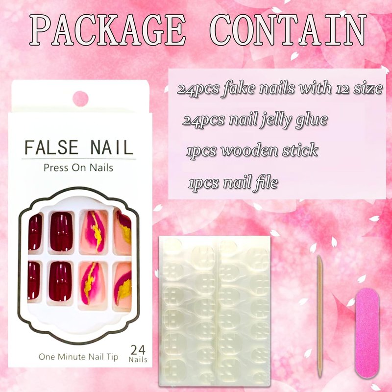 - 【False Nails Sets】You'll get 24 medium coffin false nails in 12 sizes. 1 mini nail file, 1 small wooden stick, 1 piece of press on nails adhesive sticky tabs.