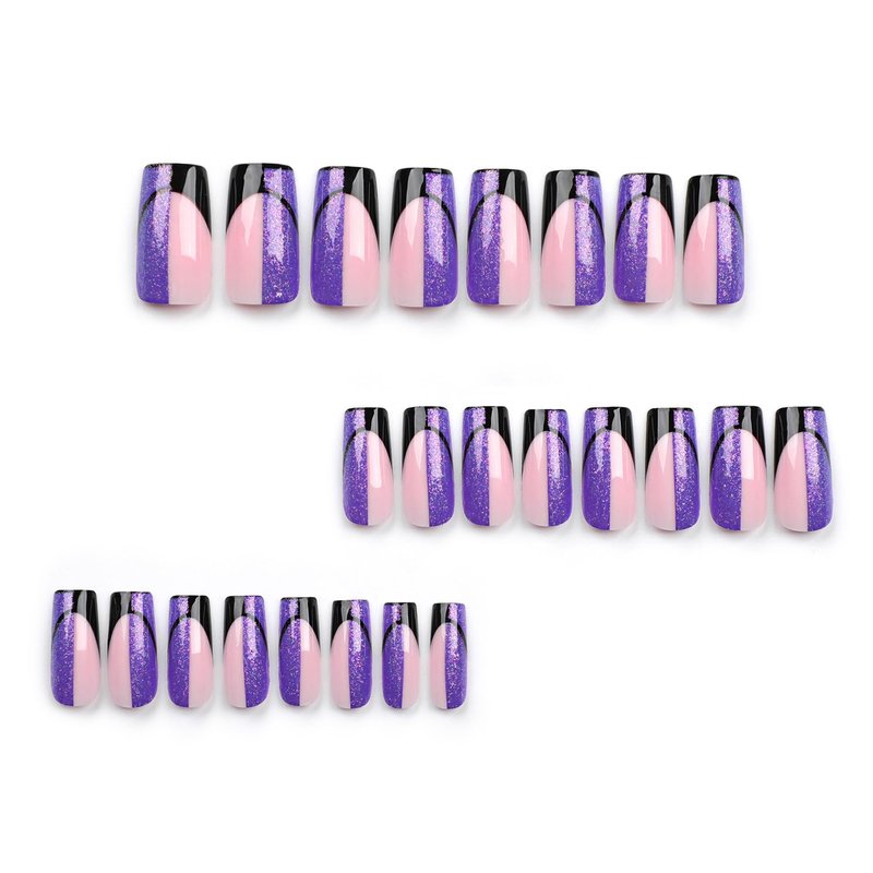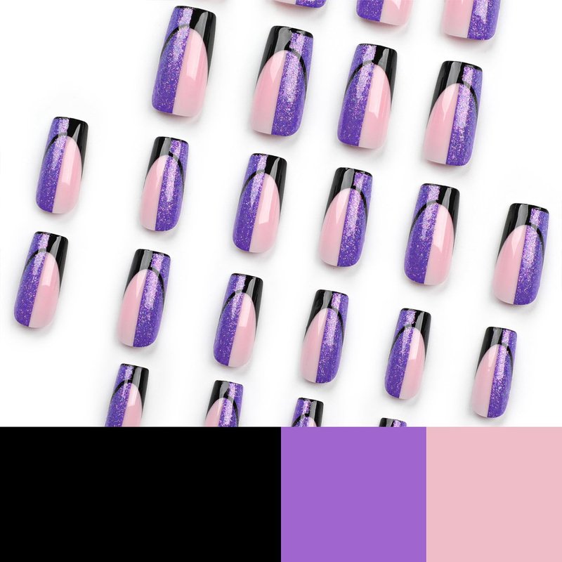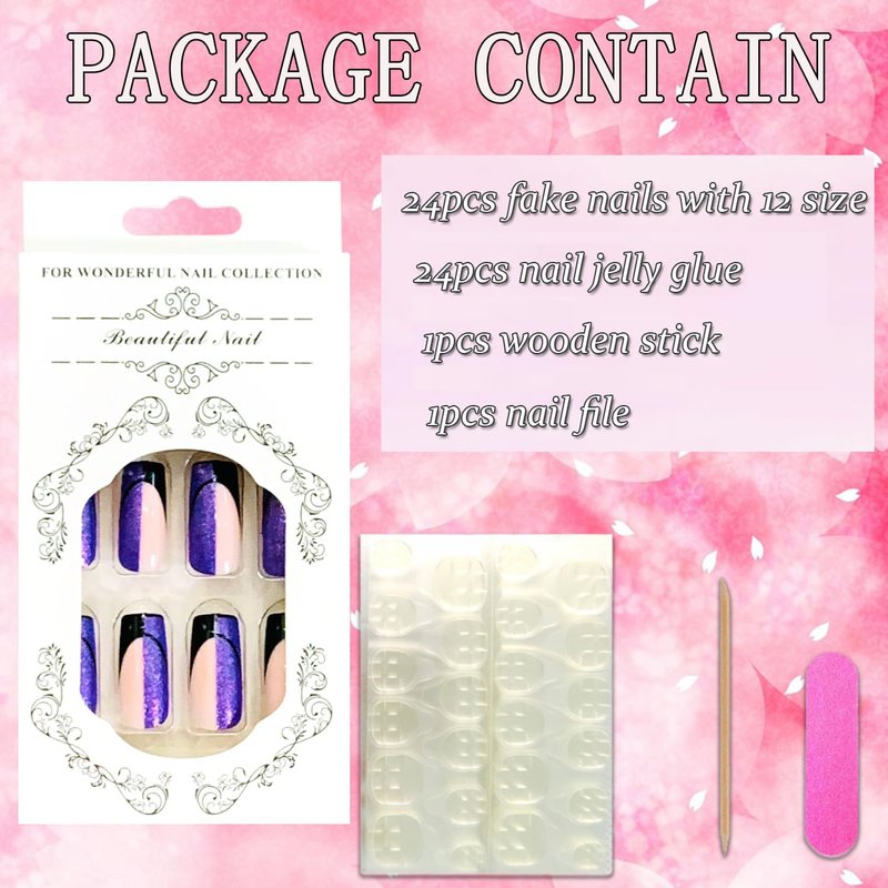 Vezocim Purple Press on Nails Square French Tips 24Pcs Glossy Full Cover Medium Acrylic Square False Nails with Designs Artificial Coffin Reusable Fake Nails Glue ons Fingernails for Women Girls