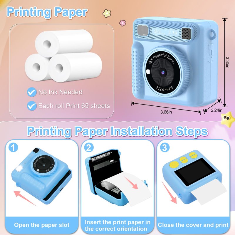 - Multifunctional Camera for Kids - Equipped with 1080P HD video recording, 16x digital zoom, built-in flash, time-lapse photography, continuous shooting, and filters. It also includes 5 games and an MP3 player, making this print camera as a multi-functional device that caters to a wide range of interests and activities.