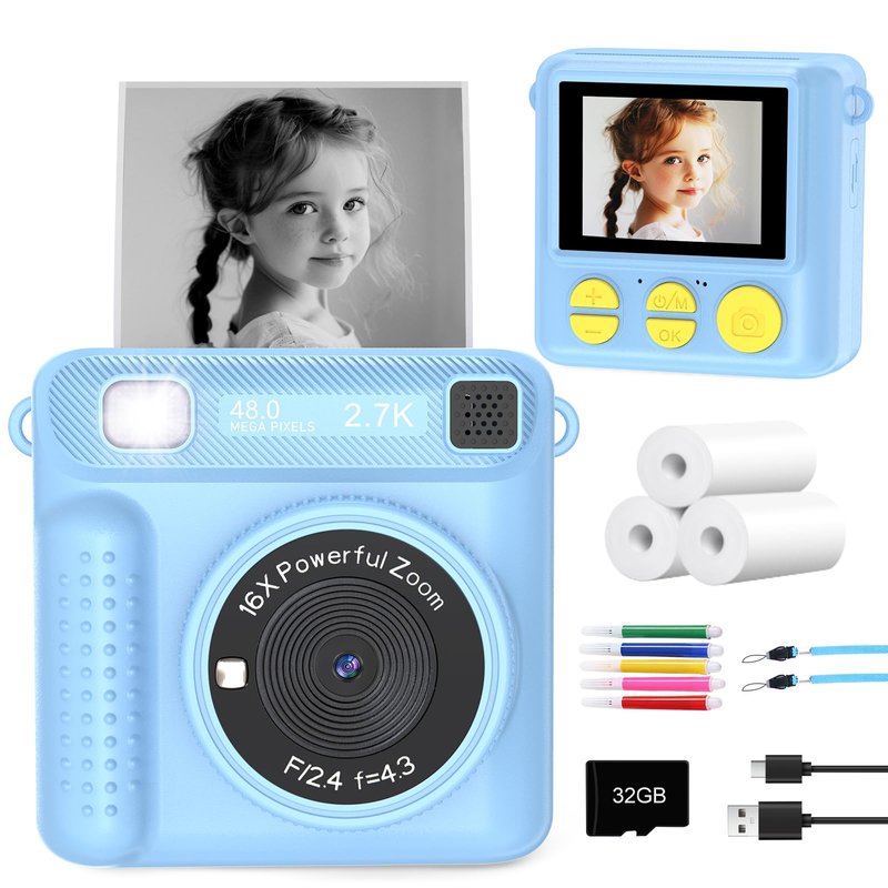 - Inkless Instant Print Camera for Kids - Just one button press, the creative kids digital camera produces black and white photos within seconds, while saving color images to the SD card. Featuring advanced thermal printing technology, there's no need for ink or toner. It comes with 3 rolls of BPA-free thermal paper, ensuring safe and hassle-free print photos for your child.