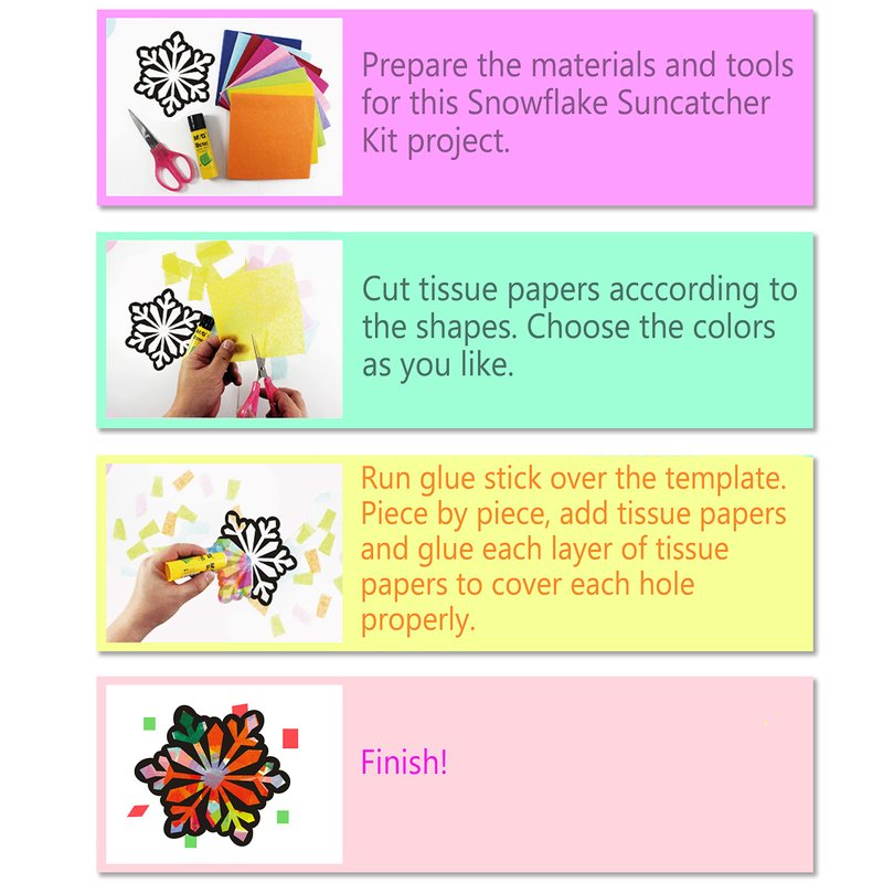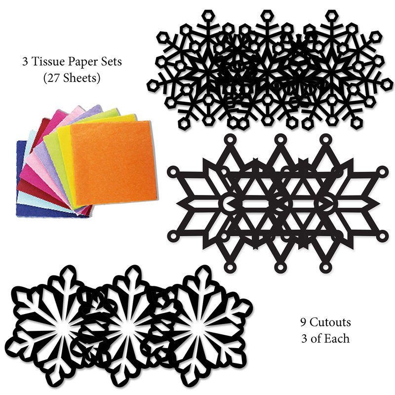 - [SUNCATCHER CRAFT – SNOWFLAKE] Includes 3 Sets of 3 Precut Snowflake Templates and 3 Sets of 9 Assorted Color Tissue Papers.