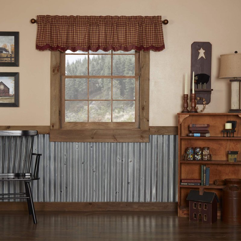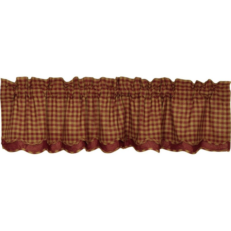 Dark khaki tan and warm burgundy checkered plaid add a relaxed, primitive feel to your windows. Our Burgundy Check Layered Valance measures 16x72 inches and includes a softly scalloped edge and a unique layered look constructed with 100 percent cotton. The rustic country valance is machine washable and includes a 3.25 inch rod pocket for easy hanging.