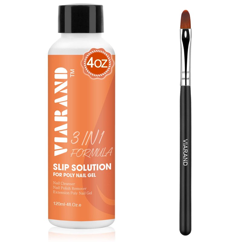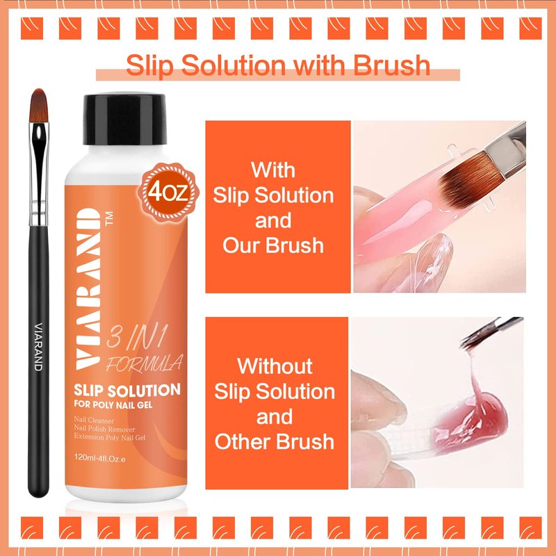 - 【VIARAND POLY GEL SLIP SOLUTION KIT】Viarand poly gel slip solution kit has 4OZ of slip solution and a brush. Dip the brush in slip solution to easily glide the poly gel to extend the nails.