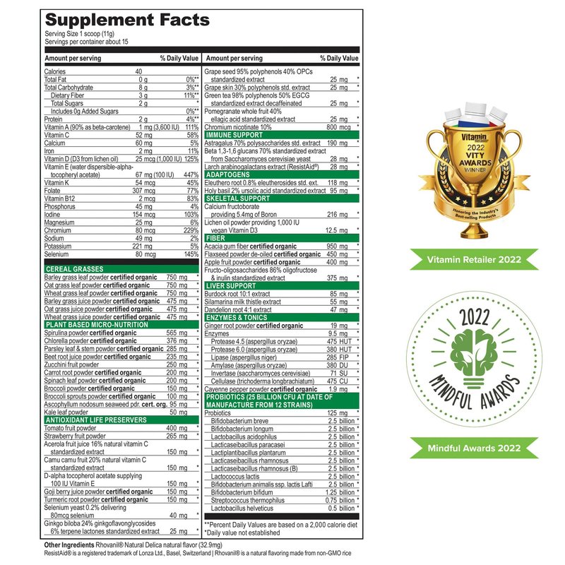 - Whole Body Nourishment: Nutrient-dense fruits and vegetables such as spirulina, spinach, camu camu and goji berries offer key vitamins, minerals and antioxidants;* Milk thistle and dandelion aid liver health while vegan vitamin D3 offers skeletal support*