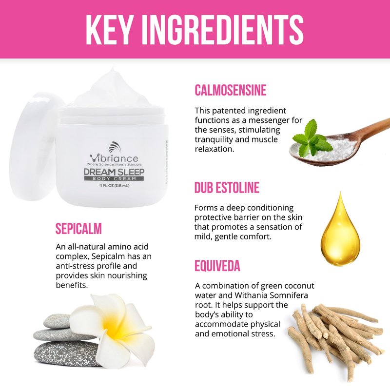 - MORE THAN JUST A LOTION: Vibriance Dream Sleep Body Cream contains Sepicalm and Calmosensine to promote feelings of relaxation. We also included soothing moisturizers, making this a dry skin cream that calms and soothes while revitalizing and protecting.
