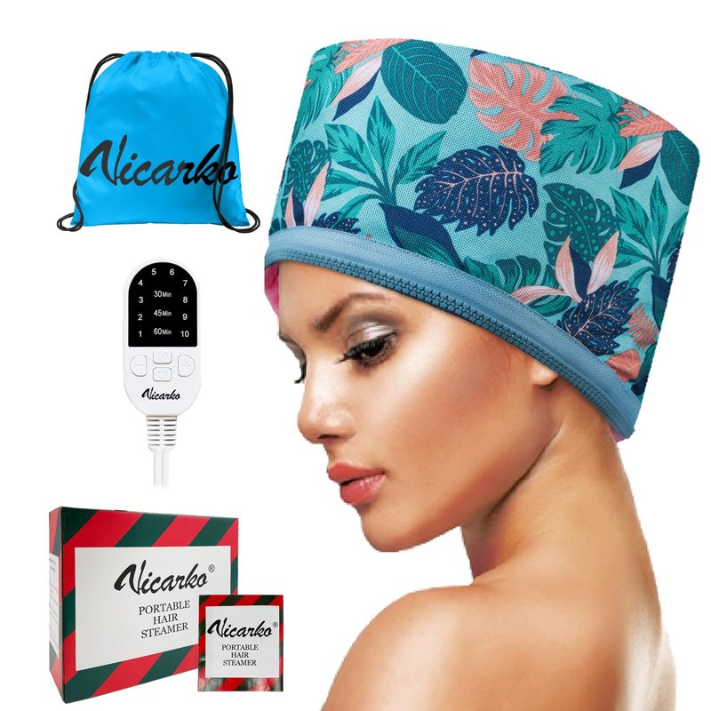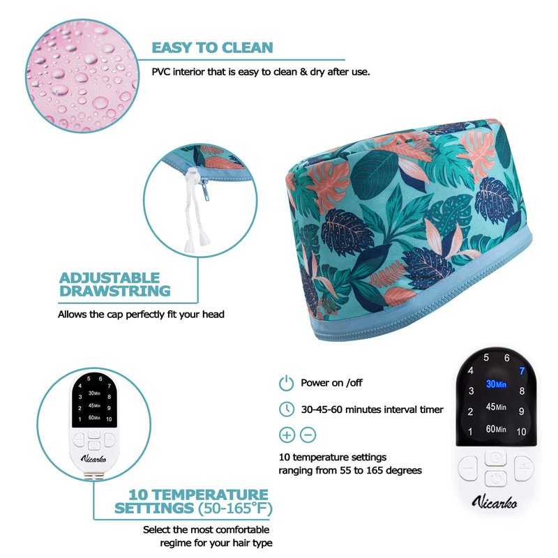For oil, moisture, or deep-conditioning treatments, VICARKO Hair Steamer Heat Cap delivers even distribution of heat and helps your hair absorb treatments quicker and deeper. Just plug it in, adjust the heat settings and enjoy a home hair spa. It also supports heathier-looking locks while protecting from moisture. Selectable temperature settings can be used on most hair types & textures. Also one size fits most with an adjustable drawstring to perfect fit your head. Features Why a Hair Steamer Cap Applying heat to hair and scalp opens pores and hair cuticles. It also enhances the benefits of favorite hair treatments to leave hair smooth & shiny. One Size Fits Most Wide & deep cap ensures you easily cover 360° of your head. You may also adjust the cap to fit your head perfectly with a head strap at the back. For Most Hair Types & Textures 10 temperature settings ranging from 55 to 165 degrees precisely control the level of heat. It allows you pick the right temperature for your hair type. Automatically shuts off with a timer. Lightweight, Portable & Comfortable Lightweight & Portable Compared with an old and heavy hooded-dryer, the steamer cap is much more convenient to use. It heats up fast and consistently, thanks to multiple heating zones. You will have the flexibility of relaxing on the couch or in bed with the 118” power cord and lightweight design of the cap. Also compact enough to store easily with a dust bag comes with. Extended Power Cord & Stylish Mailer Box You will have the flexibility of relaxing on the couch or in bed with the 118” power cord and lightweight design of the cap. It comes a colorful cardboard mailing box with holiday prints, a matching dust bag, and a user manual for quick start. Easy Maintenance Inside lining of the cap is easy wipe-down & water-resistant. Optional use with a disposable shower cap may protect the hair steamer cap from hair treatment residue.