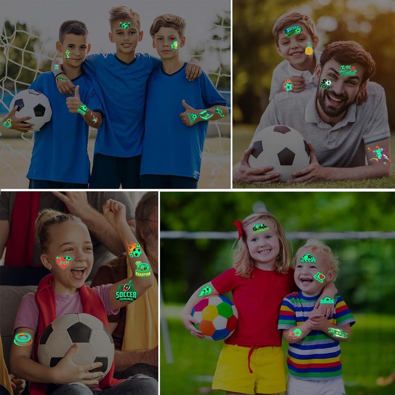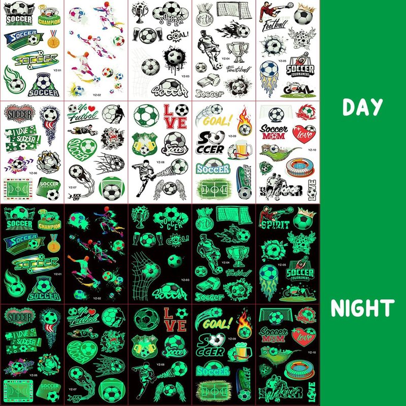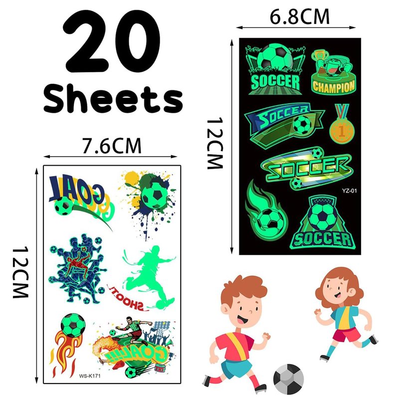 - ⚽️ Soccer Tattoos Boys: 20 sheets of glow in the dark soccer temporary tattoos for kids with soccer balls, soccer players, soccer fields, trophies and more are popular with soccer fans of all ages.