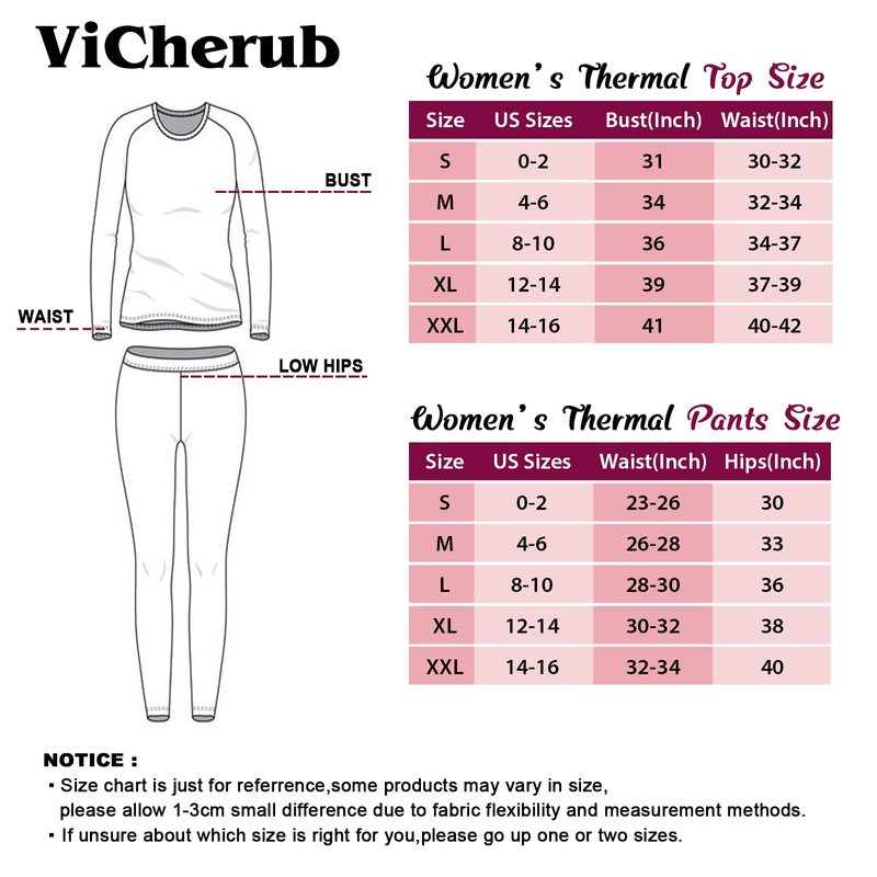 - 『Ideal Gift for Family/Friends』: Warmth is the best expression of love in the cold winter.Ideal for women or girls.A fancy womens base layer will keep you warm in chilly winters,which is an ideal gift for parents,wife,friends,shows your meticulous consideration and care.Giving them a surprise,a warmth,vicherub thermal underwear is the best choice.