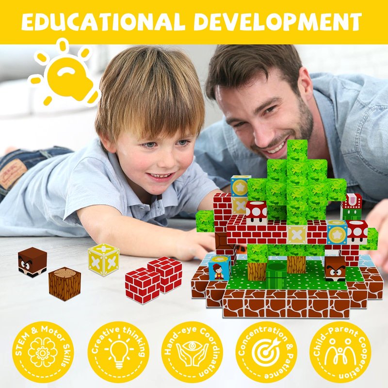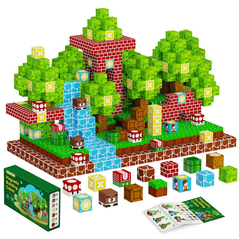 - 🏆Buildable Game Elements: This Magnetic building blocks set is a dream for game fans! It includes elements like stone, gold coins, mushrooms, and man-eating flowers. Design your own level breaking game by stacking on metal surfaces like desktops, garage doors, or refrigerators.