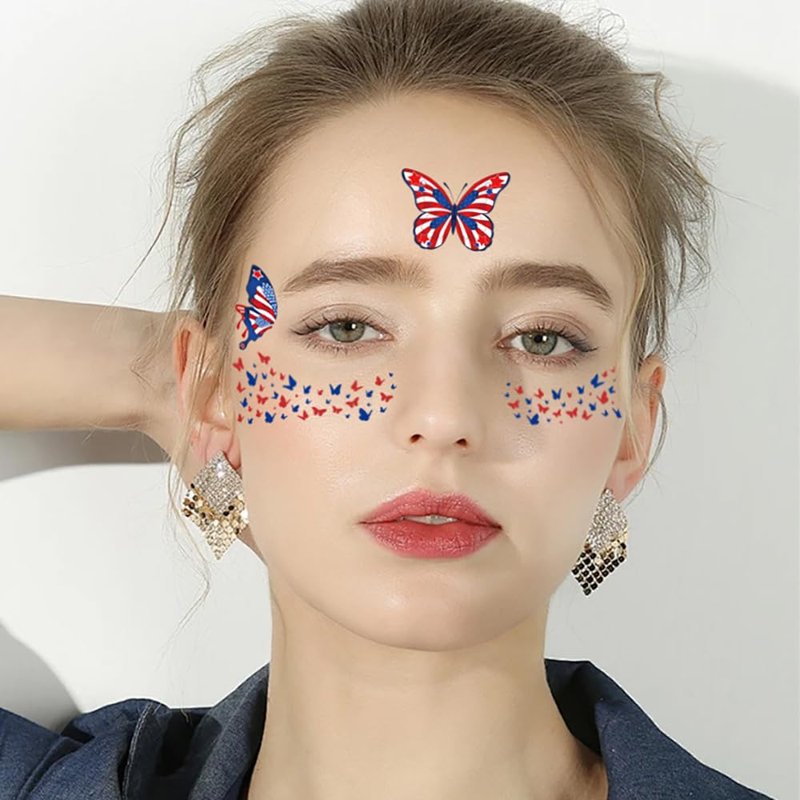 Independence Day patriotic temporary tattoos for adults kids exquisite waterproof tattoos Features: 2024 latest design, patriotic face tattoos with glow-in-dark effect High quality material, safe, non-toxic, odorless, durable and waterproof Easy to use and remove How to use: 1.Cut out the pattern 2. Remove the protective film. 3. Apply the fake tattoo on completely dry skin. 4. Wet the back of the white paper completely with water. 5. Tear gently after 20 seconds or more. How to Remove 1. Wipe the temporary tattoo with alcohol or make-up remover or cold cream or baby oil and wait 10 seconds. 2. Rub gently and repeatedly until the tattoo disappears or scrub it off with soap and water.