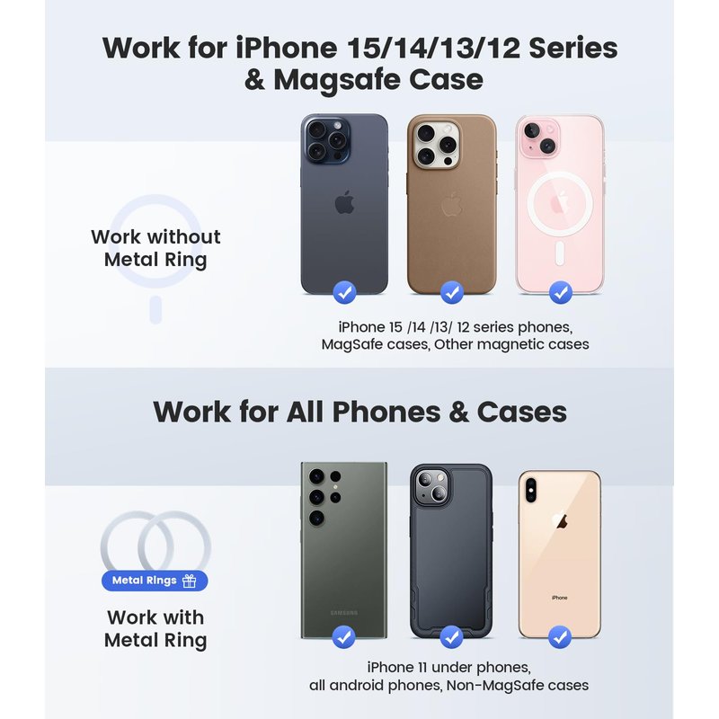 - 【𝗔𝗹𝘄𝗮𝘆𝘀 𝗙𝗶𝘁 𝗔𝗹𝗹 𝗣𝗵𝗼𝗻𝗲𝘀】Considering some phones and cases without MagSafe, we provide extra 2 metal rings as gifts. Once pasted, your phone/case can have the MagSafe function. Therefore, our tesla magsafe phone holder is compatible with all phones and cases. And the hollow design of the metal ring will not affect the wireless charging like other ordinary metal plates
