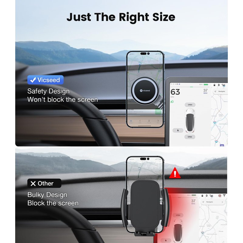 - 【𝗦𝗺𝗮𝗹𝗹 & 𝗙𝗹𝗲𝘅𝗶𝗯𝗹𝗲】Just the right size! Say goodbye to phone mount for tesla that block your speedometer! Vicseed car phone mount won't take up space in your car or obstruct your view. With a flexible 360° ball joint, the car mount allows you to use your smartphone horizontally or vertically