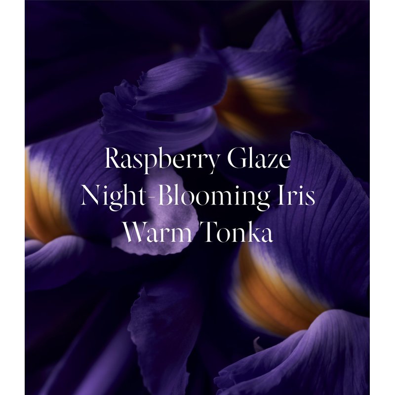 - Scent notes of raspberry glaze, night-blooming iris, and warm tonka.