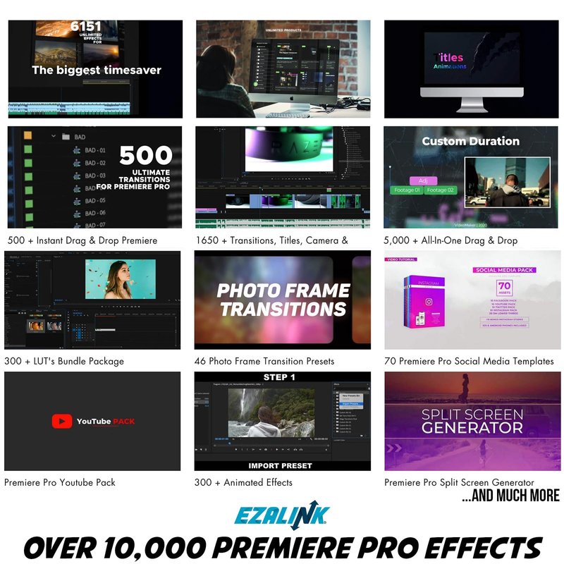 - 10,000+ Premiere Pro Assets Pack: Including transitions, presets, lower thirds, titles, and effects.