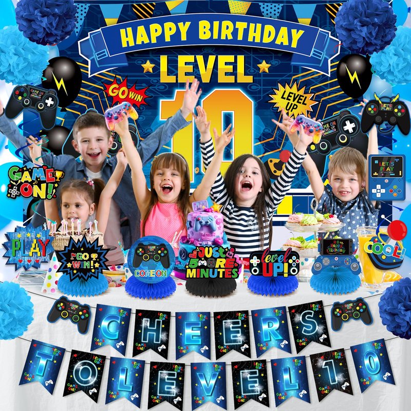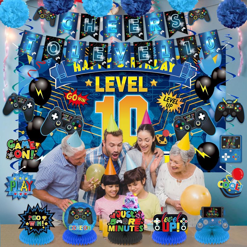 Video Game 10th Birthday Party Decorations Blue Black Happy Birthday Level 10 Banner Backdrop Honeycomb Centerpieces Hanging Swirls Tissue Paper Pompoms for Boy 10 Years Old Game Controller Supplies