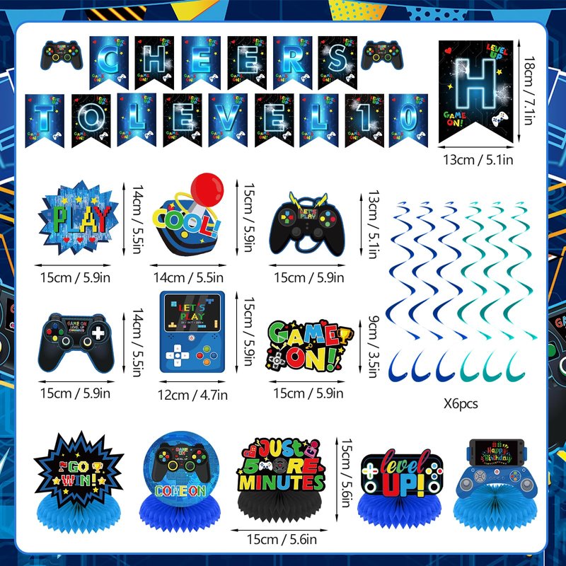 - 【Easy to Assemble】: The video game birthday party banner decorations come with a long rope, and there are 4 holes in the corner for you to hang it up. According to the instructions in the picture to install the video game hanging swirls streamers and honeycomb centerpieces, then string the LEVEL 10 Pre-Strung banner with ribbons. An easy and quick way to start your 10th birthday party