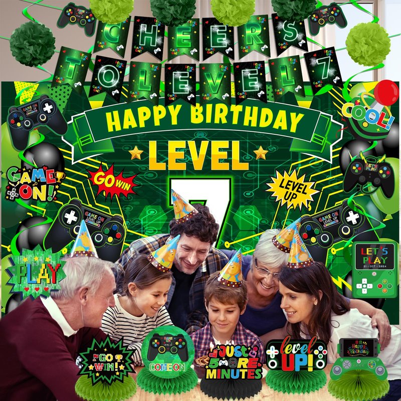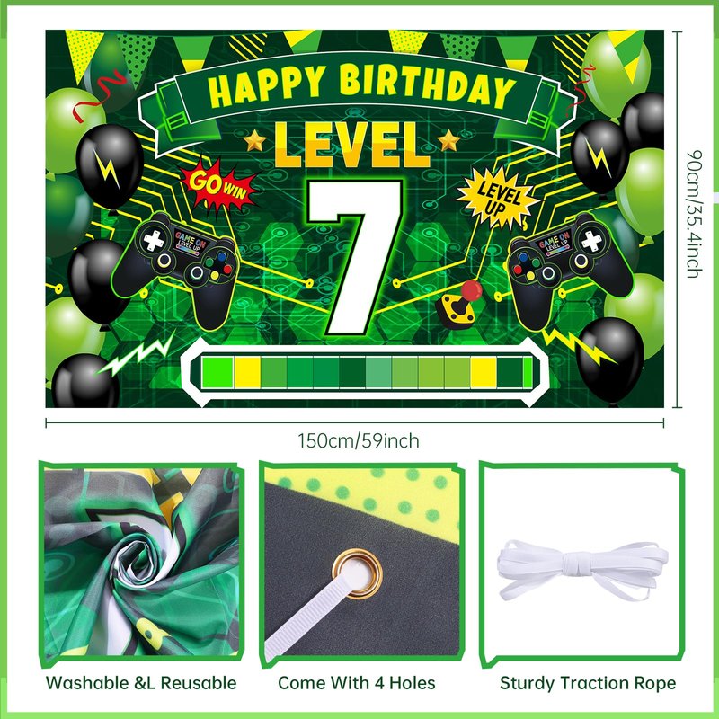 - 【Reliable Material】: The video game level 7 Pre-Strung banner, tissue paper pompoms, honeycomb centerpieces and video game controller hanging swirls are made of quality paper cardboard and quality foil with a smooth surface, the video game element patterns are all double printed. The Happy Birthday LEVEL 7 backdrop banner is made of polyester fabric with bright colors. It is washable and reusable