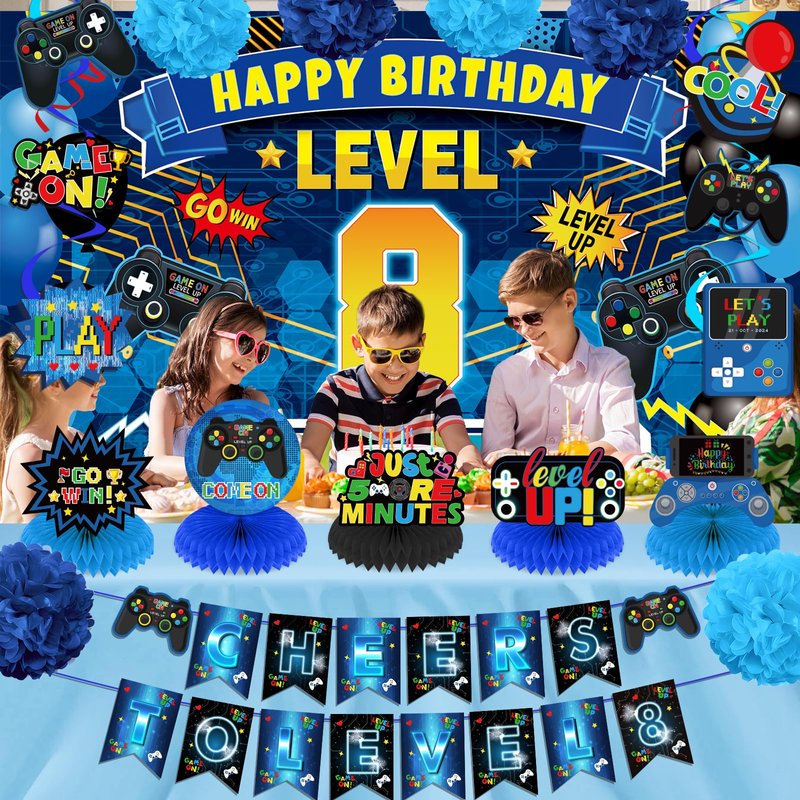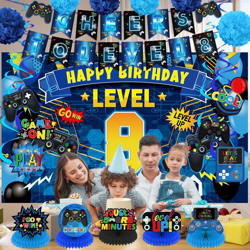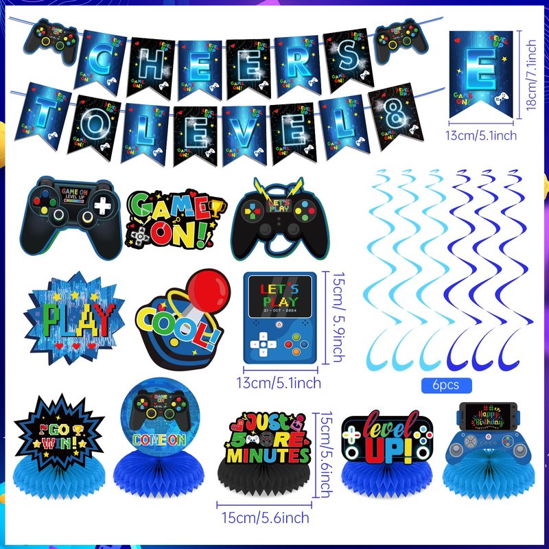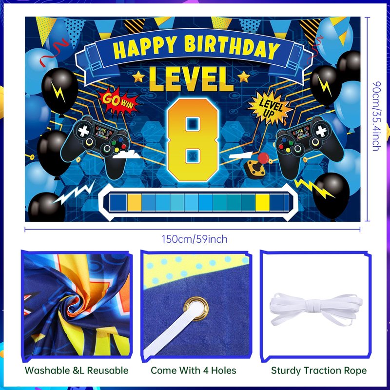 - 【Easy to Assemble】: The video game birthday party banner decorations come with a long rope, and there are 4 holes in the corner for you to hang it up. According to the instructions in the picture to install the video game hanging swirls streamers and honeycomb centerpieces, then string the LEVEL 8 Pre-Strung banner with ribbons. An easy and quick way to start your 8th birthday party