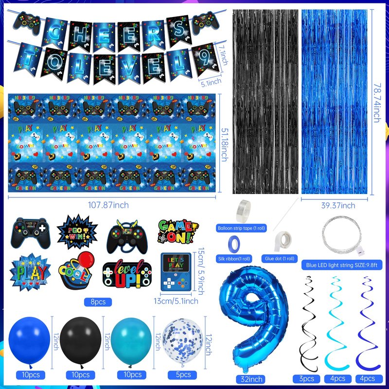 - 【Package Included】: The Cheers to Level 9 decorations set including 1pc CHEERS TO LEVEL 9 Pre-Strung Banner, 1pc foil number 9 balloons, 3pcs black double hanging swirls streamers, 8pcs video game theme hanging swirls in different patterns, 1pc Video Game Theme Tablecloth, 1pc blue LED Lights, 2pcs Foil Curtains Backdrops (blue+black) and 35pcs latex balloons(Including 10 pieces blue balloons+10 pieces fruit blue balloons+10 pieces black balloons+5 pieces transparent balloons)