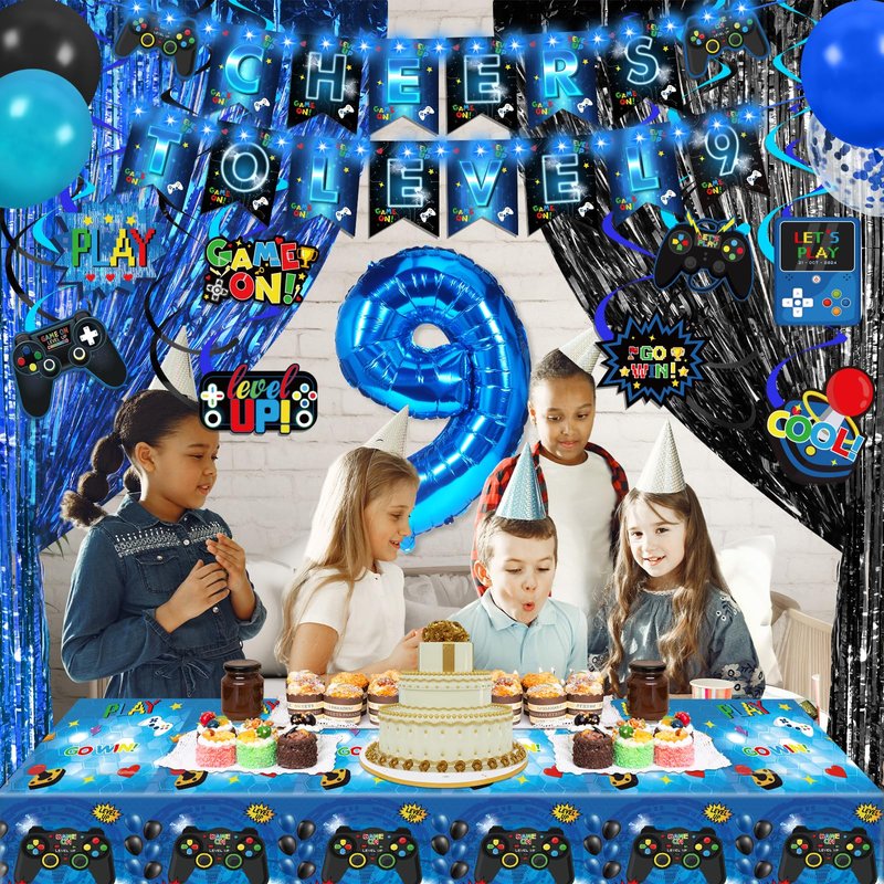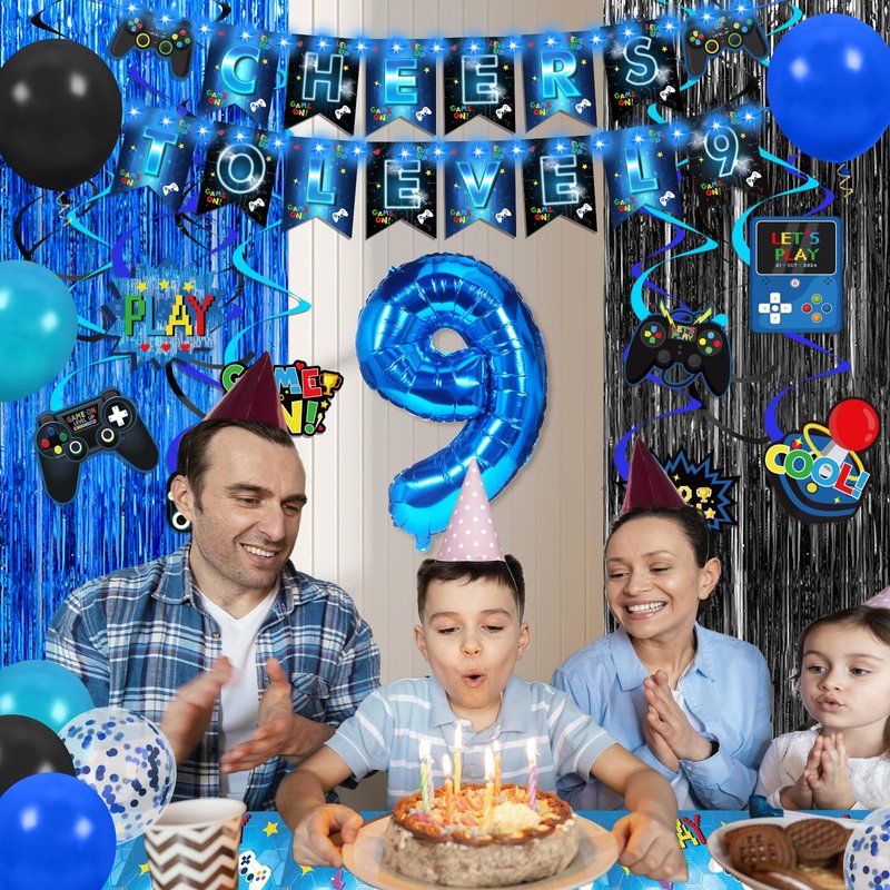 - 【Easy to Assemble】: An easy and quick way to start your 9th birthday party. All you need to do is put the video game hanging card with hanging swirls streamers, take a few minutes to put hanging swirls together with plastic hooks, Then string the LEVEL 9 Pre-Strung banner with ribbons, hang the light on the banner and you can hang them up to decorate your video game birthday party