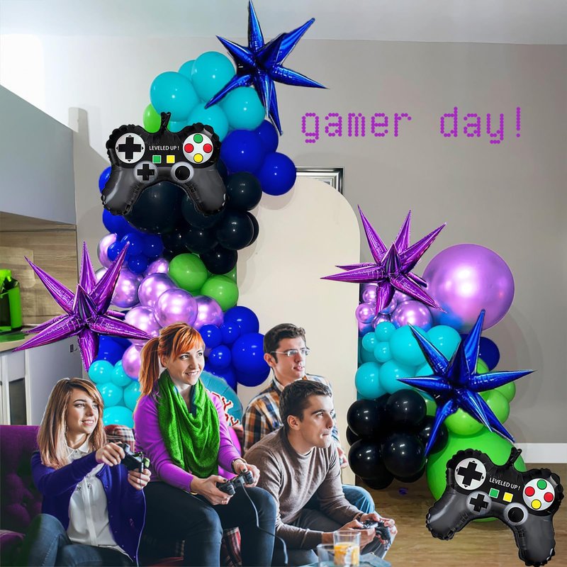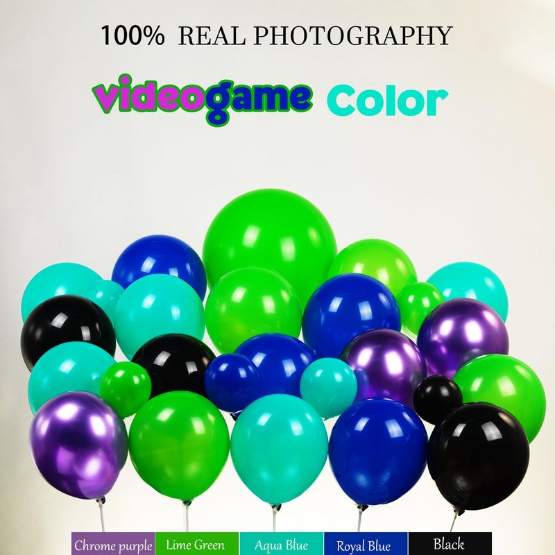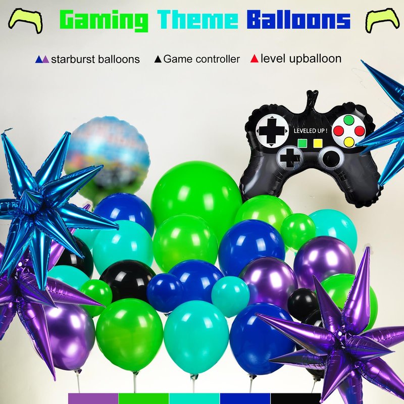 - 【Gamer Theme Balloon Kit】Includes the following balloons of different sizes, 5 inches, 10 inches, 12 inches, 18 inches. We chose green, purple, royal blue, Teal blue and black as the theme color palette, and added a variety of game controller balloons, 18-inch game pattern balloons, starburst aluminum foil balloons, and glue chain sets allow you to create a cheerful and energetic atmosphere
