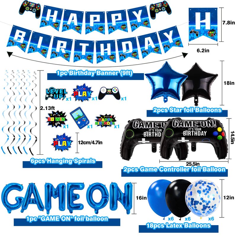 - 【Gamer Birthday Decorations Set】You will get 1 happy birthday banner,2 game controller balloons,18 pieces 12-inch latex balloons,1 set of 16-inch Game On balloon sets, 2 stars aluminum foil balloons and 6 video game hanging swirl.