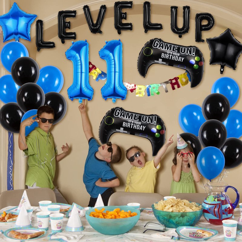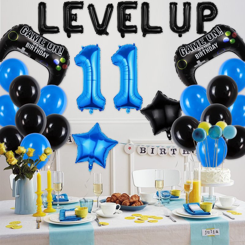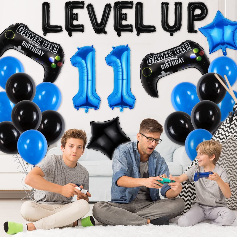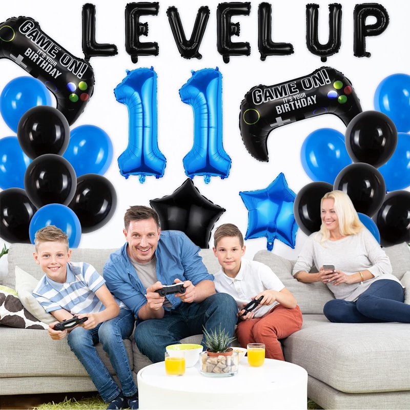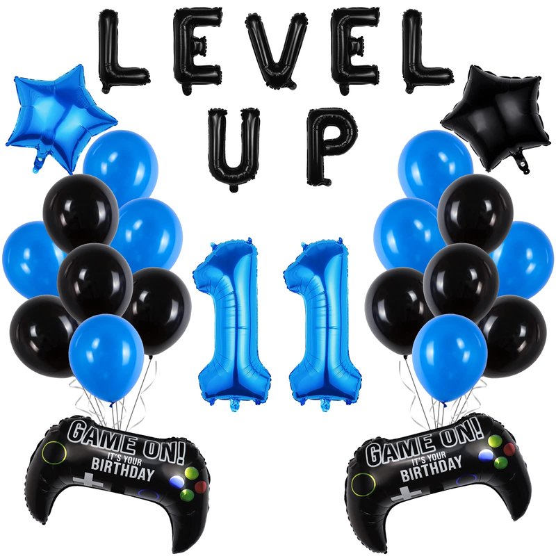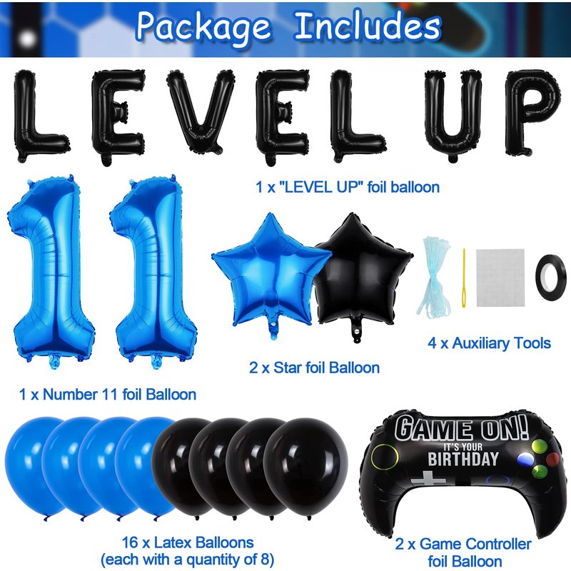 - 11TH BIRTHDAY PARTY BALLOON KIT: 2*gamepad aluminum foil balloons, 2*star aluminum foil balloons, 1 set of 16-inch Level Up foil balloon sets. 1*32 inch number 11 balloon, 16*10 inch latex balloon (8 dark blue, 8 black).