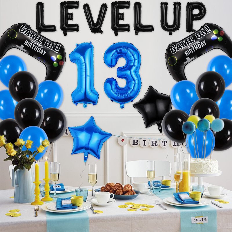 - 13TH BIRTHDAY PARTY BALLOON KIT: 2*gamepad aluminum foil balloons, 2*star aluminum foil balloons, 1 set of 16-inch Level Up foil balloon sets. 1*32 inch number 13 balloon, 16*10 inch latex balloon (8 dark blue, 8 black).