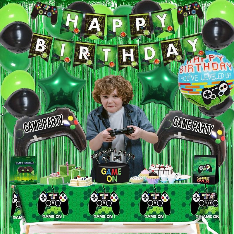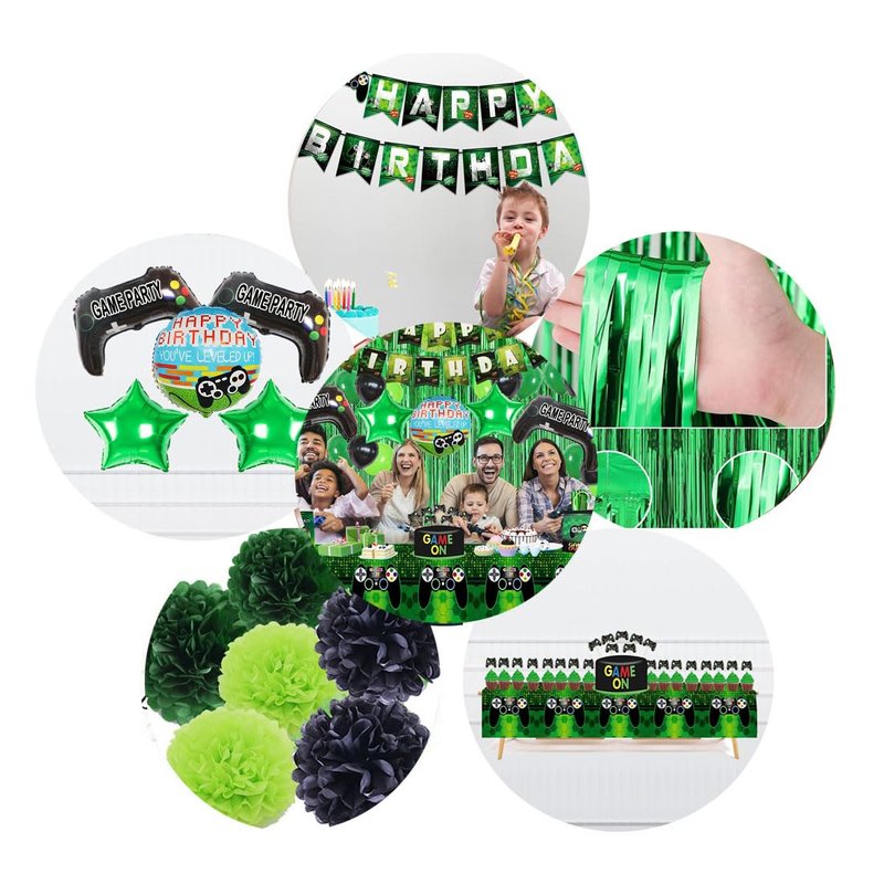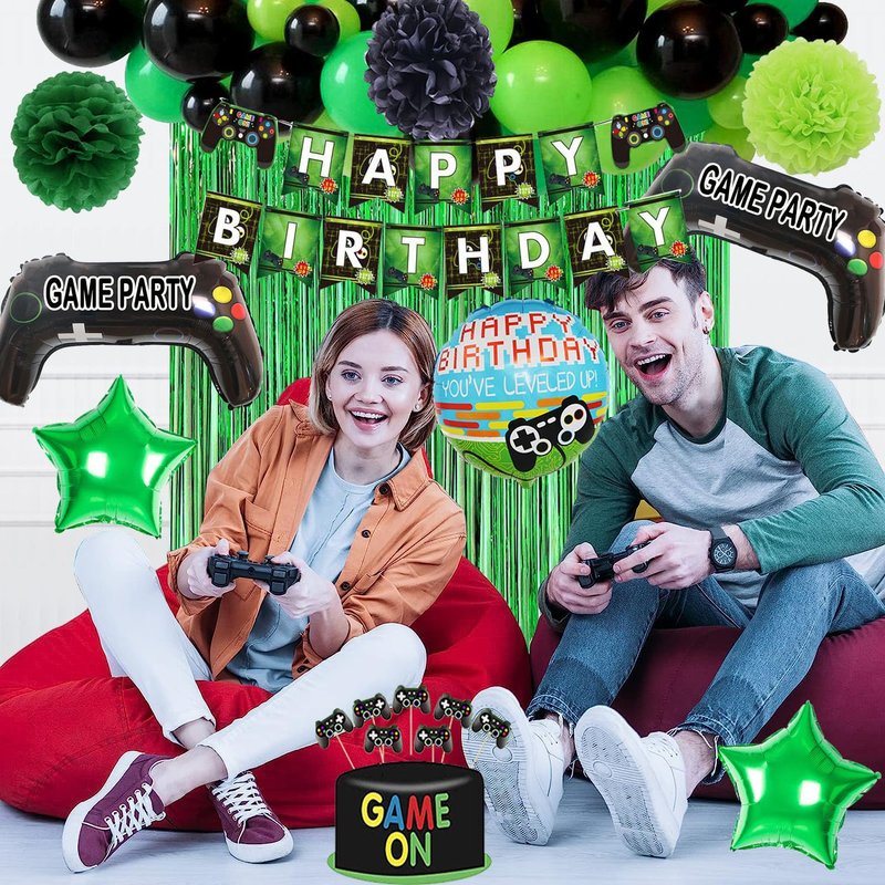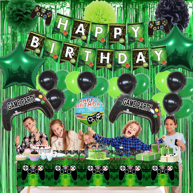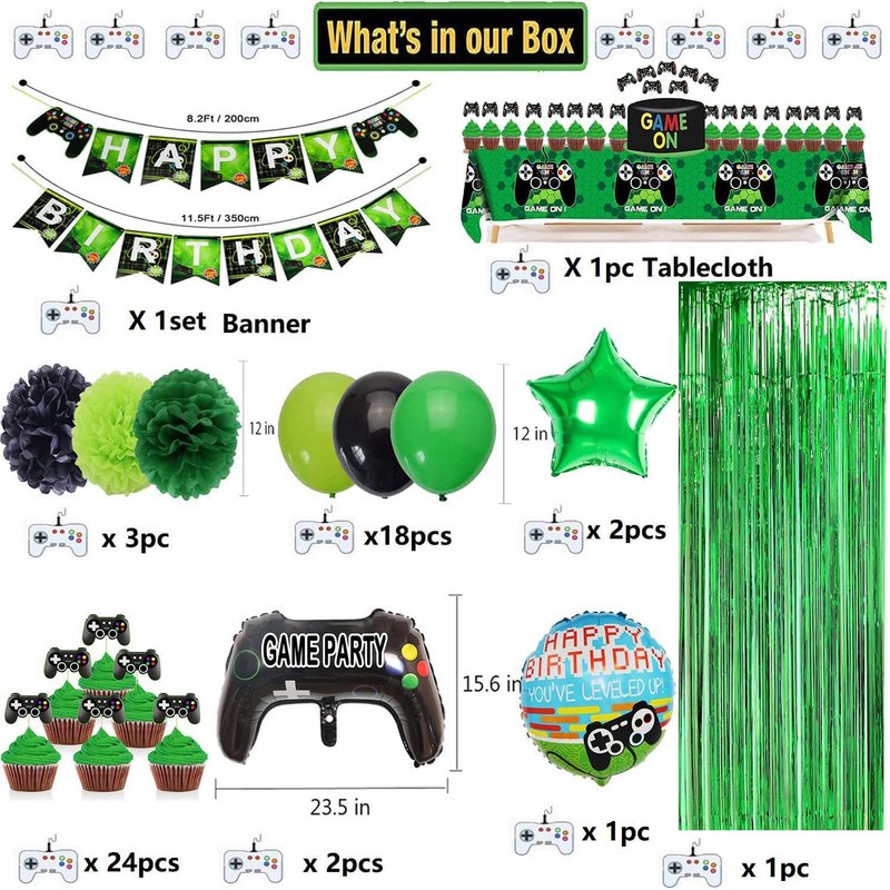 - [Great Value Pack:]:What you get? You will receive 1pc video game party happy birthday banner, 18pc (green,black,Fruit Green) latex balloons, 2pc video game foil balloons, 2pc star foil balloons, 1pc round game foil balloon, 3pcs 10in tissue flowers; 1pc video game tablecloth ; 24pc cake topper, 1pc Foil Curtain,