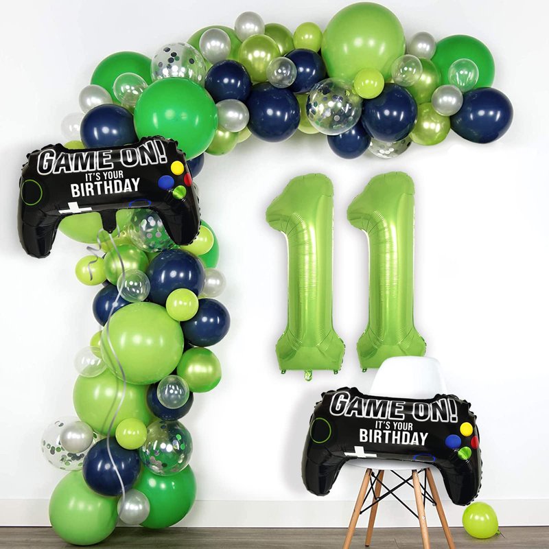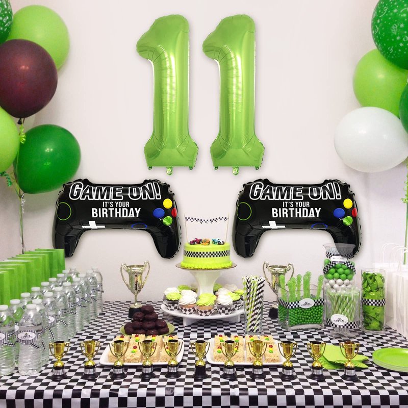 - GAME BIRTHDAY PARTY SUPPLIES: You will get 2 X Black GAME ON print controller balloons, 1 X Giant lime green number 11 balloon