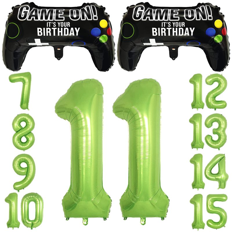 Video Game Party Balloons for Boys 11th Birthday Decorations- 2 Packs Game Controller Mylar Balloons with Green Number Balloons 11