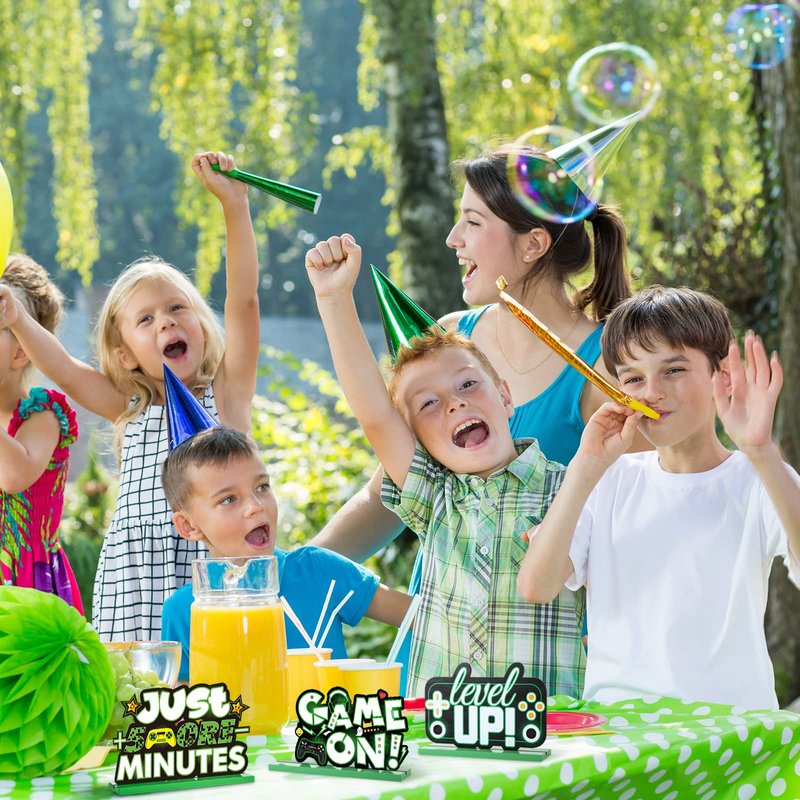 - Video game table top decorations includes 3 designs: 1. Just 5 more minutes table centerpieces has pixelated letter sign with game controller pattern; 2. Game on word with classic green color game pad element of video game party; 3. Level up table topper is designed with video game screen