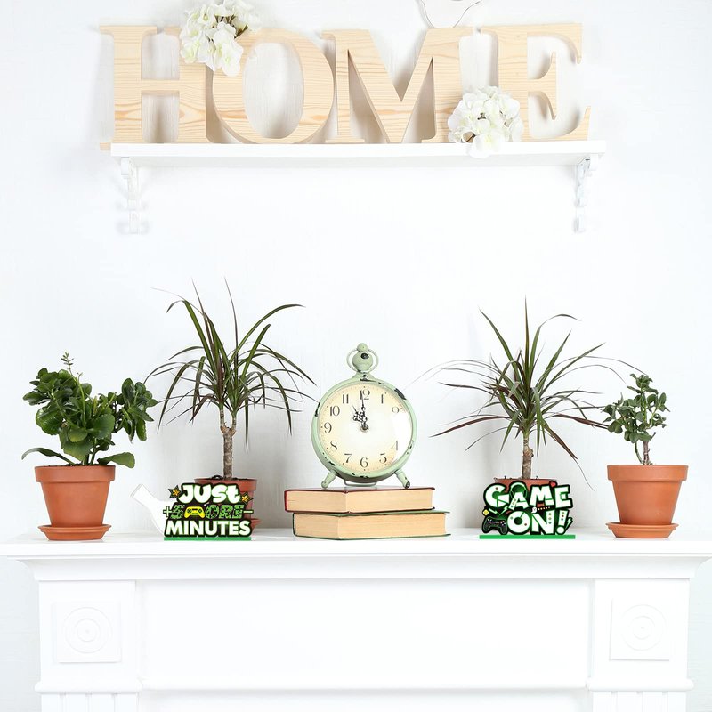 Video game blocks wooden gift table top decoration home accent pixelating sign words video game's day decor Adorable video game table decorations: Video game party table topper is durable and stylish; These video game table centerpieces have 3 different cute video game wooden decorations to let you have a rollicking good time in video game holiday; Put them on your table, shelf or mantel. Easy to decorate: Fill any space with a pixelating and happy felt sentiment; These 2020 Video Game party decorations are easy stand with wood base. Video game decoration and gift: These wooden video game table decor spell out classic video game funny quotes, video game controller, game pad, video game screen decorative pattern; Lovely video game party decoration and great video game gift. Size: Game on: approx. 20 x 12 cm/ 7.87 x 4.72 inch Level up: approx. 20 x 12 cm/ 7.87 x 4.72 inch Just 5 more minutes: 20 x 12 cm/ 7.87 x 4.72 inch Package includes: 1 x Game on table topper for video game party favor 1 x Level up table topper 1 x Just 5 more minutes table topper Note: Please make sure the size before you buying.