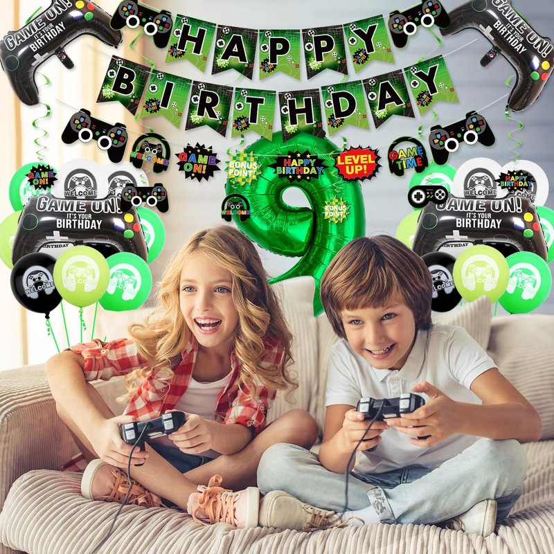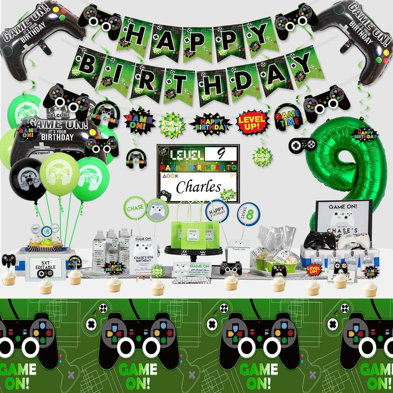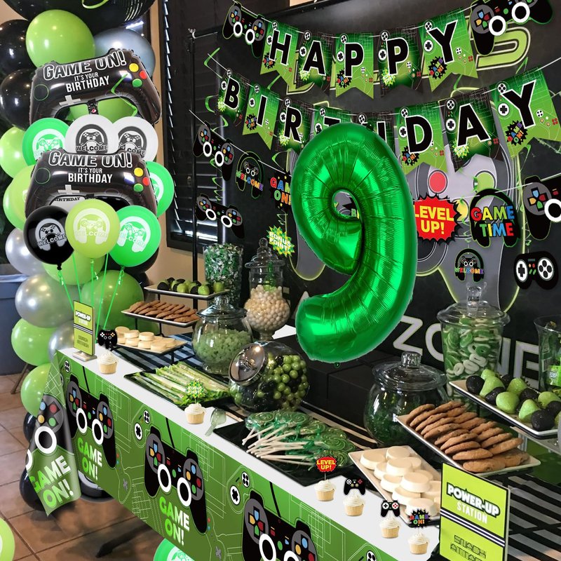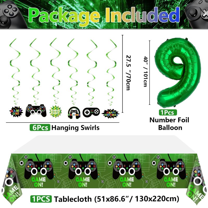 - 🎮Video Game Party Decorations: 3 set HAPPY BIRTHDAY banner and video game-themed banners, 1PC gaimg tablecloth, 1PC DIY name hanging sign, 6 Pcs hanging swirls, 10 Pcs cupcake toppers, 4 PCS controller foil balloons, 5 Pcs light green pattern balloons, 5 Pcs green balloons, 5 Pcs black balloons, 5 Pcs white balloons, 2 Pcs number 9 foil balloons.
