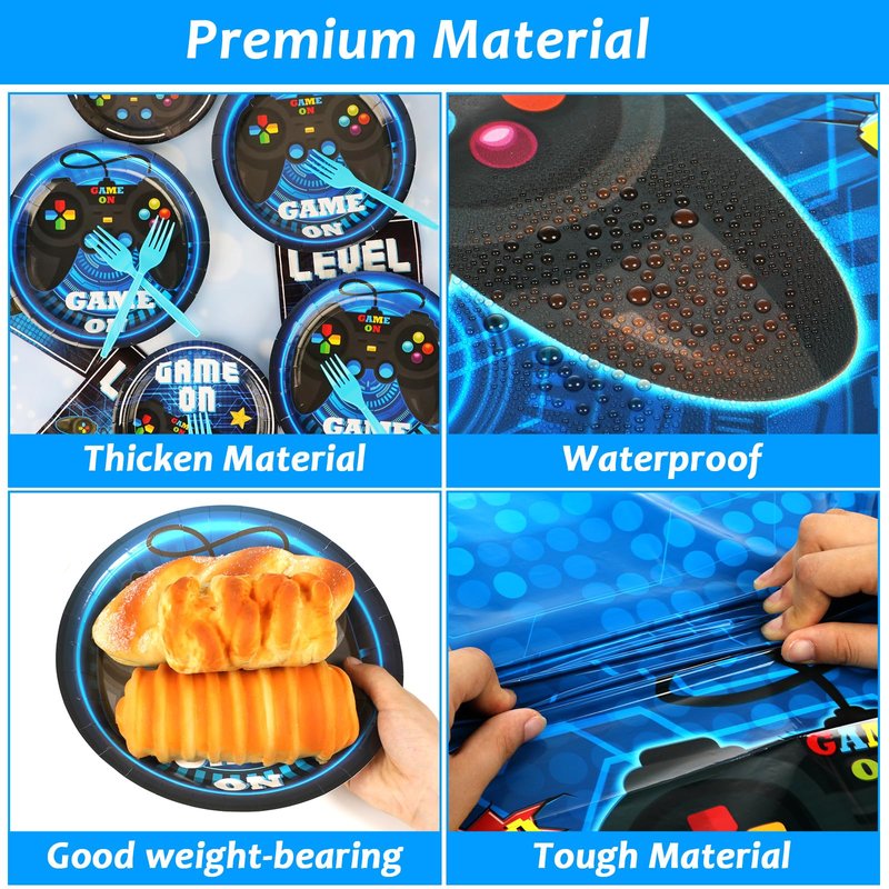 - 【High-quality Materials】All our Gaming Party Decorations Includes Plates, Napkins are made of high-quality paper, non-toxic, tasteless, heat-resistant,and durable. Video Game Party tablecloths are made of high-quality plastic.The patterns and colors are beautifully printed and fade-resistant, providing you with a party full of a Gaming Party atmosphere.