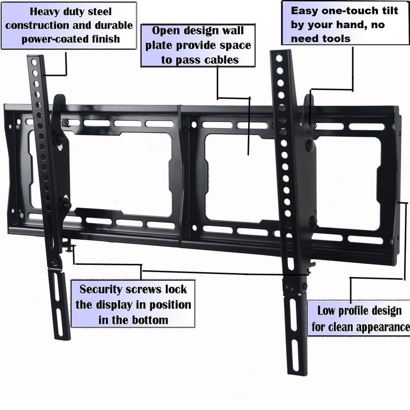 This low-profile tilt mount is designed for most 23-75 inch flat-panel TVs weighing up to 165 lbs. VESA compliant for simple installation, supports TV with mounting hole patterns up to 23.6" horizontally, and 16" vertically (VESA 600X400mm). Adjustable 15 degrees forward or backward tilts to provide comfortable viewing when the TV is mounted above eye level or to reduce screen glare. Perfect choice for mount your flat-panel TV on a wall, with stylish appearance, and it makes TV viewing so much better. Open wall plate for electrical access. Fit 16" or 24" studs typical in US homes. Common wall and TV attachment hardware are included in the box. Notice: This mount fits most 23-60" TVs, some up to 65 70 75 inch TVs manufactured in recent 3 years