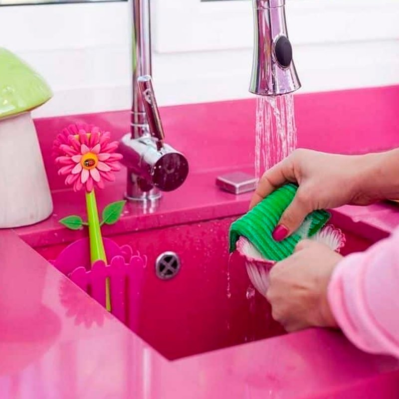 The Flower Power Pink Sink Side Set is durable making it perfect for everyday use. Brush bristles and green sponge easily attract deep-seated grease and food particles while providing scratch-free cleaning. Side set includes a pink picket fence holder with suction pads for easy storage and organization. Measuring 4-1/4-inches long by 2-1/2-inches wide by 9-3/4-inches high, this innovative side set will surely brighten the kitchen and make washing more enjoyable.