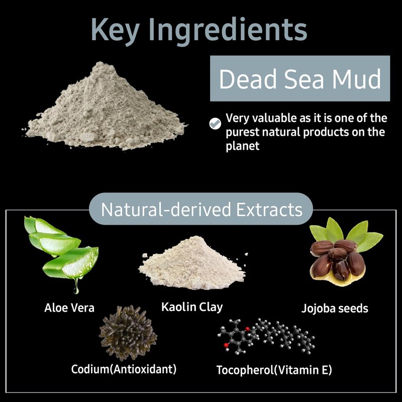 - Dead Sea: All Natural Dead sea mud is based on an advanced formula composed of Dead Sea mineral mud, aloe vera, calendula oil, Vitamin E and Jojoba oil that gently purifies and cleans clogged pores.