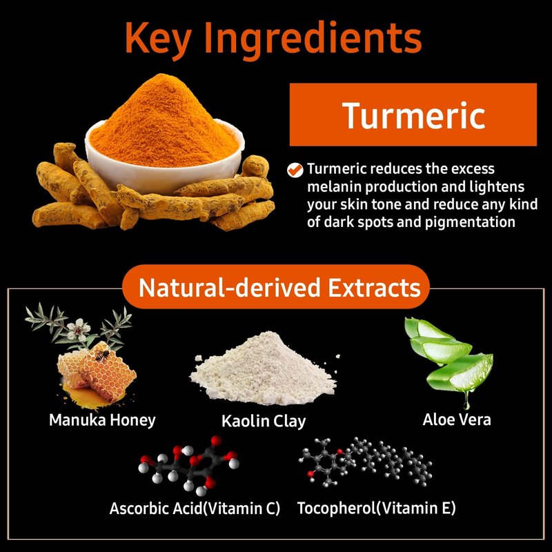 - Turmeric Clay Mask: Turmeric has soothing and brightening properties for your skin, which can effectively improve uneven skin tone to make your skin keep soft and radiant.