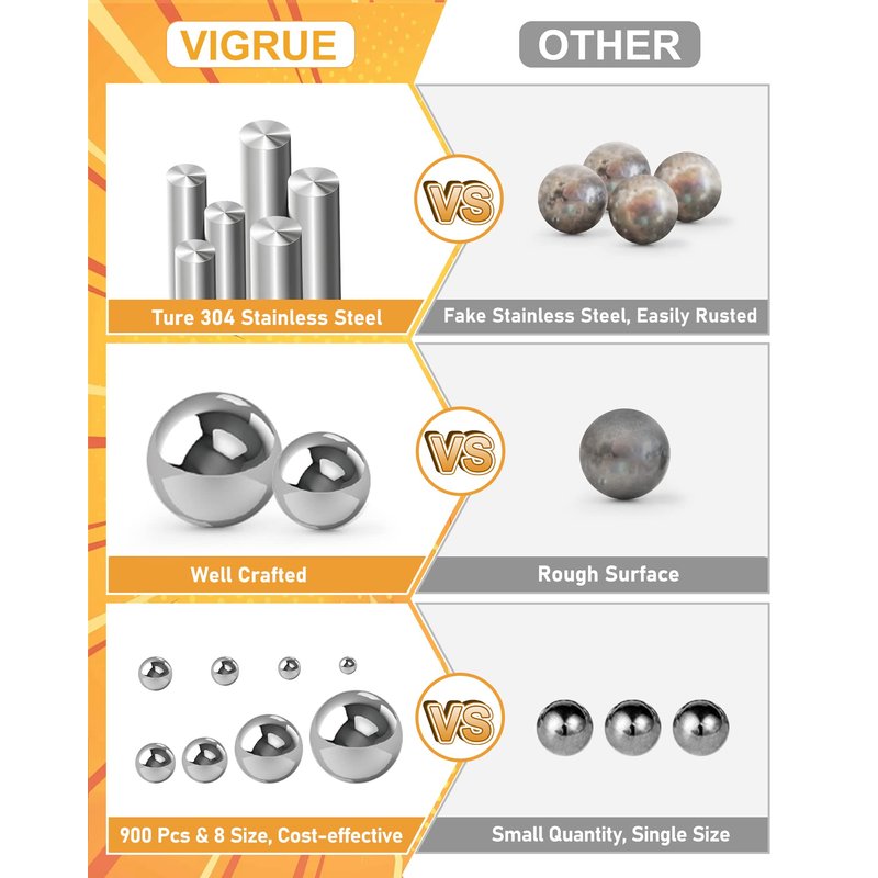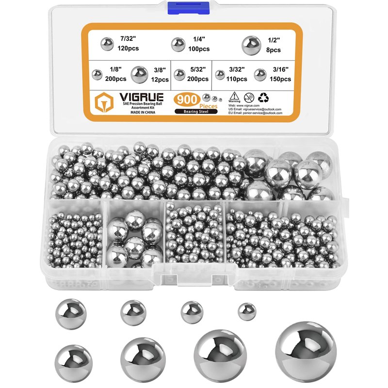 VIGRUE 900 Piece 8 Sizes Assorted Loose Bicycle Bearing Balls Assortment Kit 5/32" 1/8" 3/16" 7/32" 3/32” 1/4" 3/8” and 1/2"