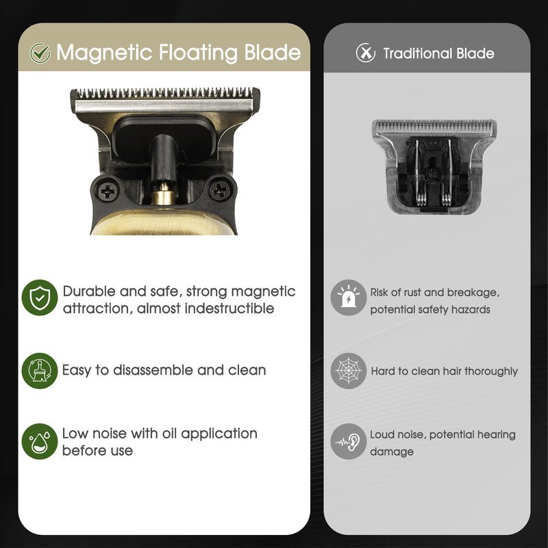 - 【MAGNETIC FLOATING BLADE】 VIIFF mens hair clippers use advanced magnetic technology with nearly indestructible magnets, ensuring greater safety and durability. The cordless clippers are suitable for men's grooming, trimming facial hair, beards, outlining, and carving.
