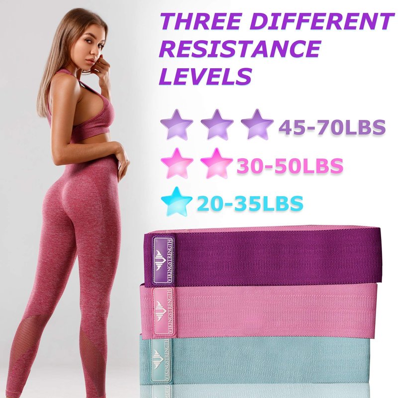 - PREMIUM GRADUAL DIFFICULTY: In the package of Vikingstrength booty resistance bands, there will be 3 bands with different resistance levels (LBS) and colors. The green color has the easiest resistance level = (20-35 LBS), the pink is medium resistance level = (30-50 LBS) and purple has the hardest resistance level (45-70 LBS).