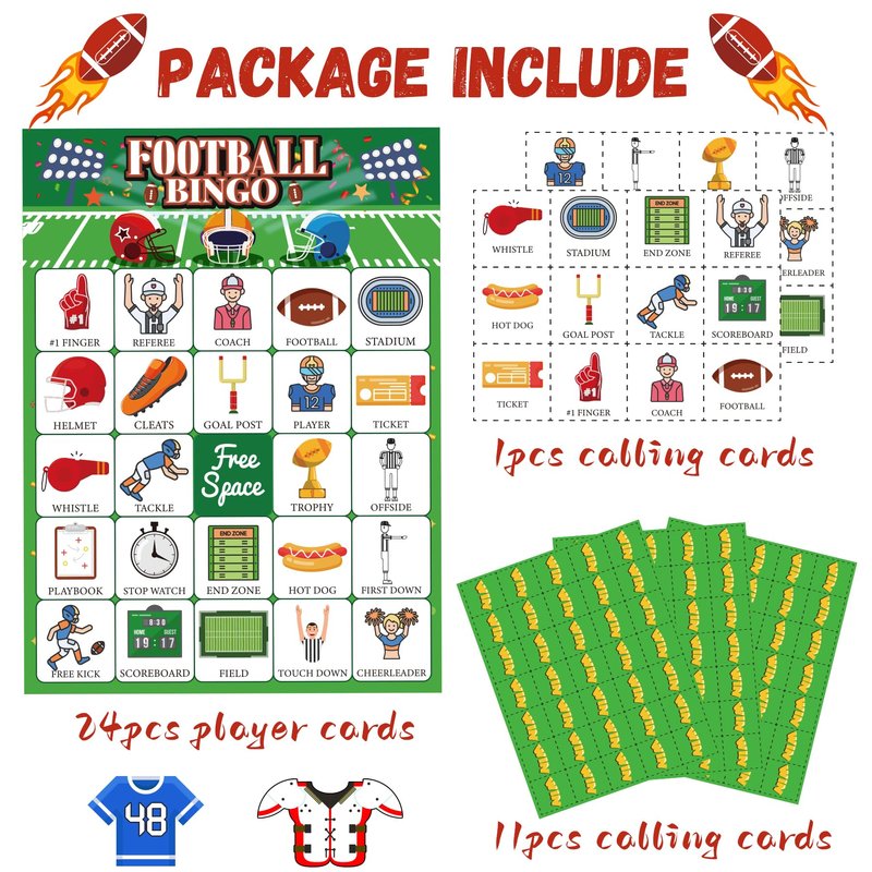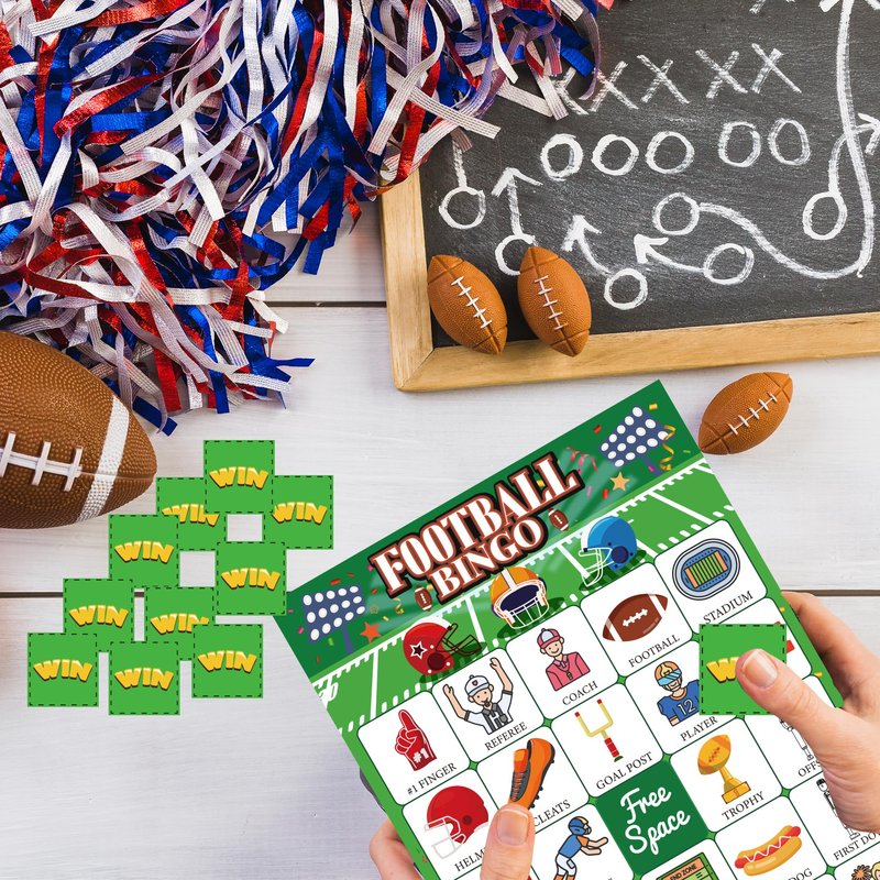 - Football games set:package includes 24 unique kids football bingo player cards,385 marking chips(11sheets),and 1caller chips.Football bingo game for large group to playing,great family and friends time game with your kiddo/friends