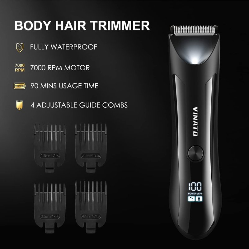 【Multi-Functional Grooming Kit】Complete male grooming system includes 4 body hair trimmer combs and 7000 rpm powerful razor attachments that are perfect for all body areas with groin/chest/back/pubic hair/balls. 【Advanced Ceramic Blades】Soft rust-proof ceramic blade built with extra sensitive trimming technology, deep close to the skin, more pruning, and low-friction heat. The ceramic blades won't rust, preventing skin irritation. 【USB Fast Charging】Cordless rechargeable beard trimmer for men is equipped with a long-running lithium-ion rechargeable battery that lasts up to 90 minutes after being fully Charged. High performance can be achieved anywhere(110-240V), great for travel, vacation, business trips, and more. 【Waterproof & Easy to Clean】Whole body washable design for easy cleaning. Blades are detachable and also easy to clean by using a brush incidental. For best results, let it dry naturally. Wet/Dry men's trimmer and fully waterproof rechargeable trimmer for in-shower use.