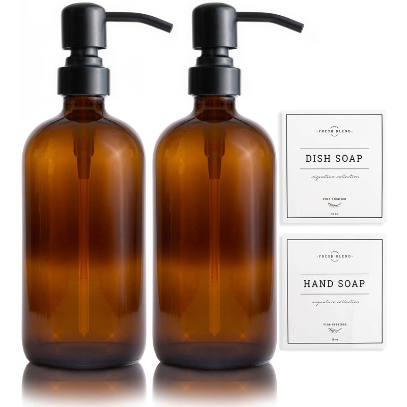 Vine Creations Amber Glass Soap Dispenser, 2 Pack Kitchen Soap Dispenser Set with Stainless Steel Pump, 16 oz Hand Soap Dispenser Bathroom, Dish Soap Dispenser for Kitchen with Waterproof Labels