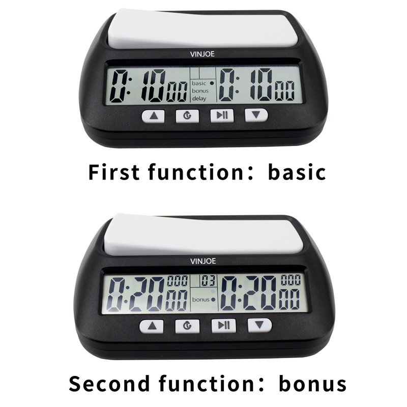 - ♟️【Four functions】♟️ VINJOE digital chess clock has four functions, Basic, Bonus, Delay and Positive Time Features. This portable chess clock can meet the timing functions required for most two-player board games, and four different timing functions add a lot of fun to the game. There is also a most special function, that is, you can return to the initial setting timing rules with one key, avoiding the trouble of restarting or pressing it several times
