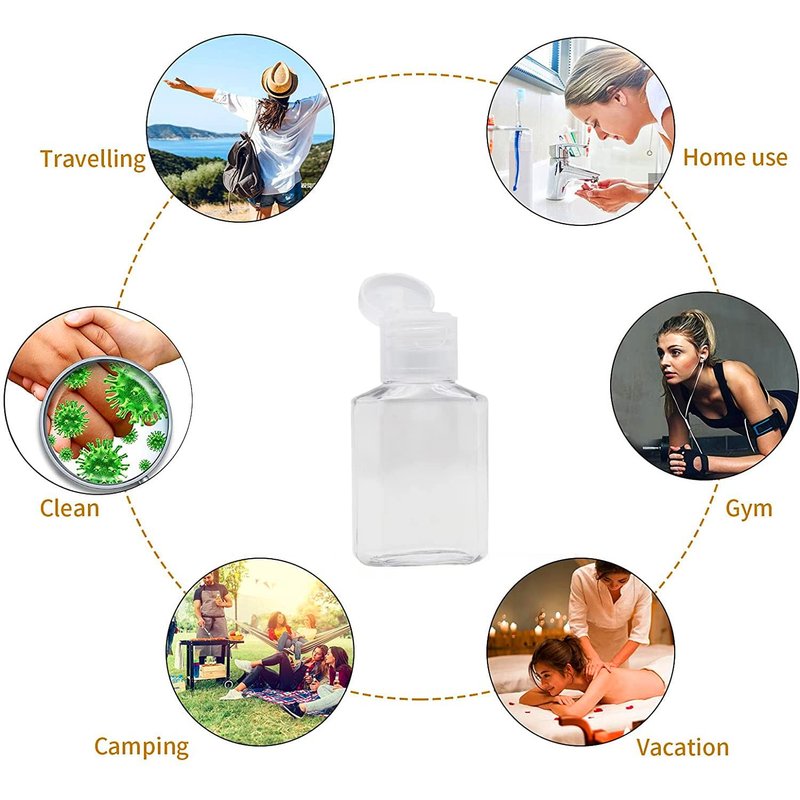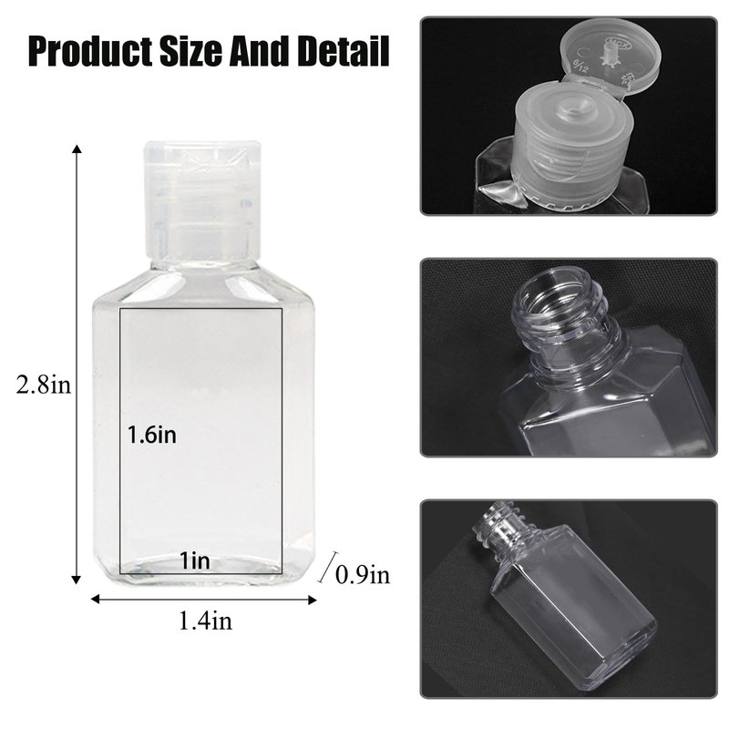 50 pcs 1 oz clear plastic empty bottles refillable with flip cap Comfort and visual design: Our travel bottles are transparent, so all your products can easily see and identify the contents.BPA free TSA Approved! Leak proof Portable: The bottle mouth thread design is matched with the flip cap to seal tightly and safe perfectly without liquid leakage. lightweight , small and easy to carry, it can be used for pockets, backpacks, hand luggage, etc. Wide range of applications: Suitable for wedding travel, vacation, camping, business trip, daily use, etc. It can be equipped with disinfectant, essential oil shampoo, conditioner, Hand Sanitizer,perfume, body and hand washing, shower gel, lotion, sunscreen or other liquids. Fill up with hand sanitizer to add a perfect touch to your wedding, party or shower supplies. As an exquisite guest gift. Include a wedding welcome bag or a basket at the entrance to the venue for safer social activities.