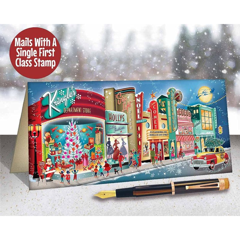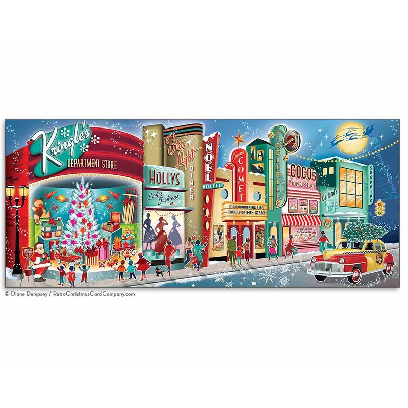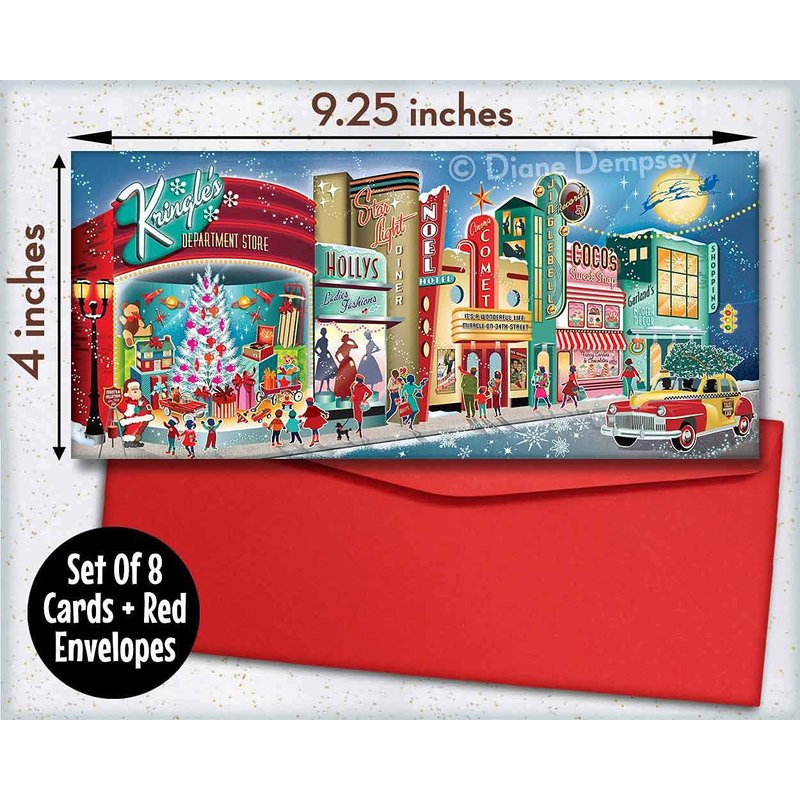 Vintage Main Street Christmas Cards - It's Christmastime in the 1950s and holiday shoppers and happy children hit the town. Santa Claus rings his bell as kids admire all the new toys in the department store window. A classic Checker cab rolls down the street carrying a fresh Christmas tree on top, "It's beginning to look a lot like Christmas!" Our most popular card of all time. At The Retro Christmas Card Company our collection of sometimes kitschy, always cool Christmas cards are designed to bring out the nostalgia lover in all of us. We are a small, family owned, American company that has been making people smile with our fun cards since 2006. These cards measure approximately 4” X 9.25”, are printed on heavy 80lb cover stock, and come with color coordinated A-10 size envelopes in clear plastic packaging.