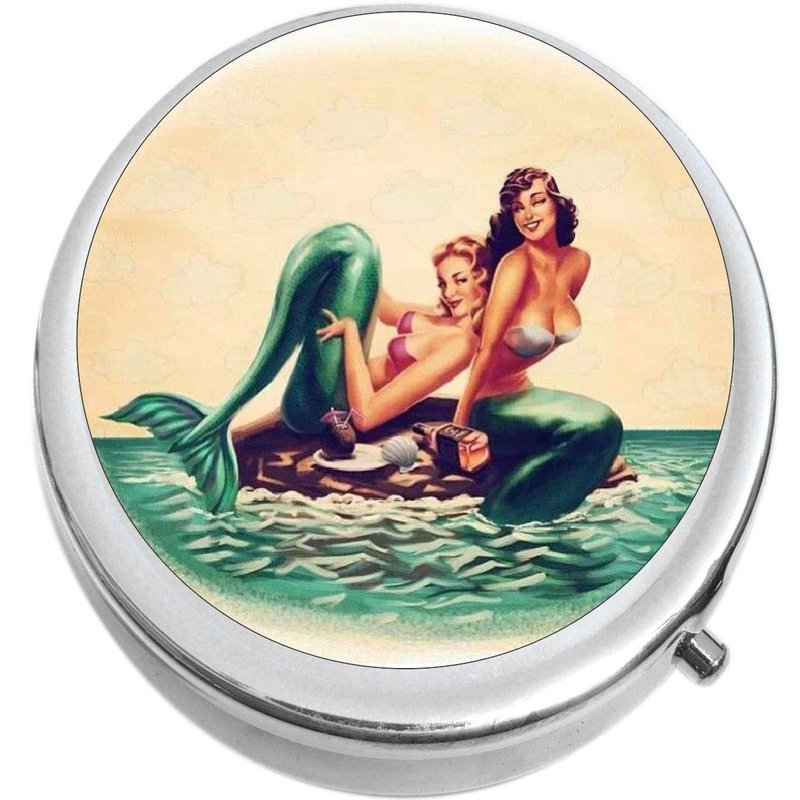 Vintage Mermaids Medicine Vitamin Pill Box - Portable Pillbox case fits in Purse or Pocket
