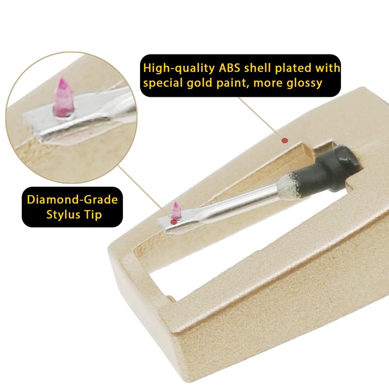 - 💎【Regarded as Universal Needle】- Yes, This golden record player needle has an exquisite appearance and high- end quality, It is just a so-called inch universal inch record player needle that nearly can be compatible with most brands' LP record players in the markets, such as Crosley, ION, Victrola, 1byone, Jenson, Innovative- Technology, Boytone, TechPlay and more. If you can not confirm whether it works with your turntable player, please message us first.
